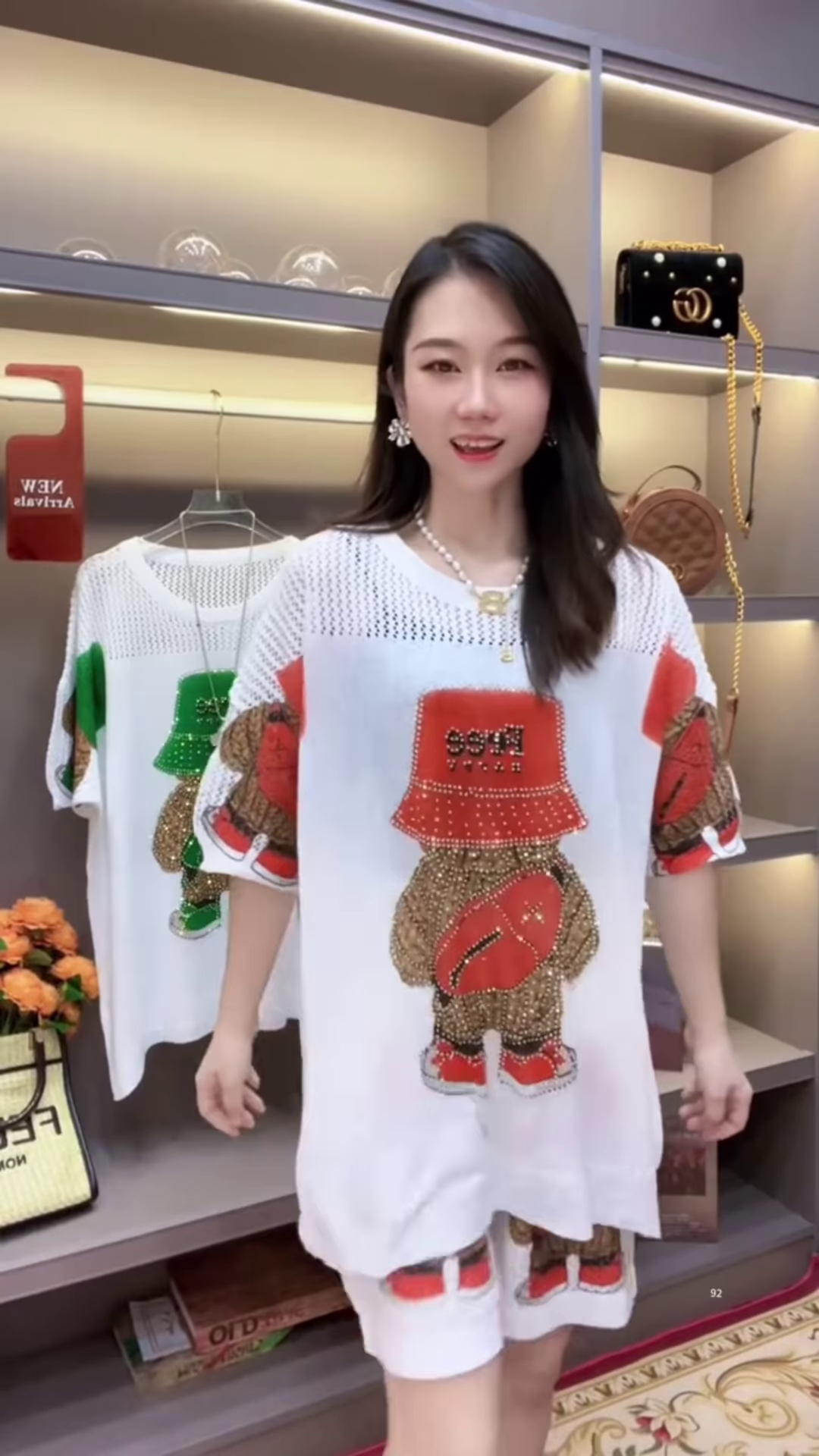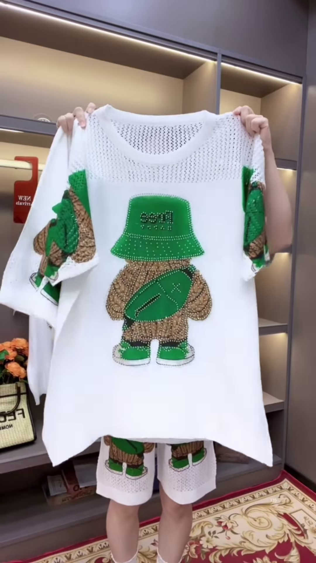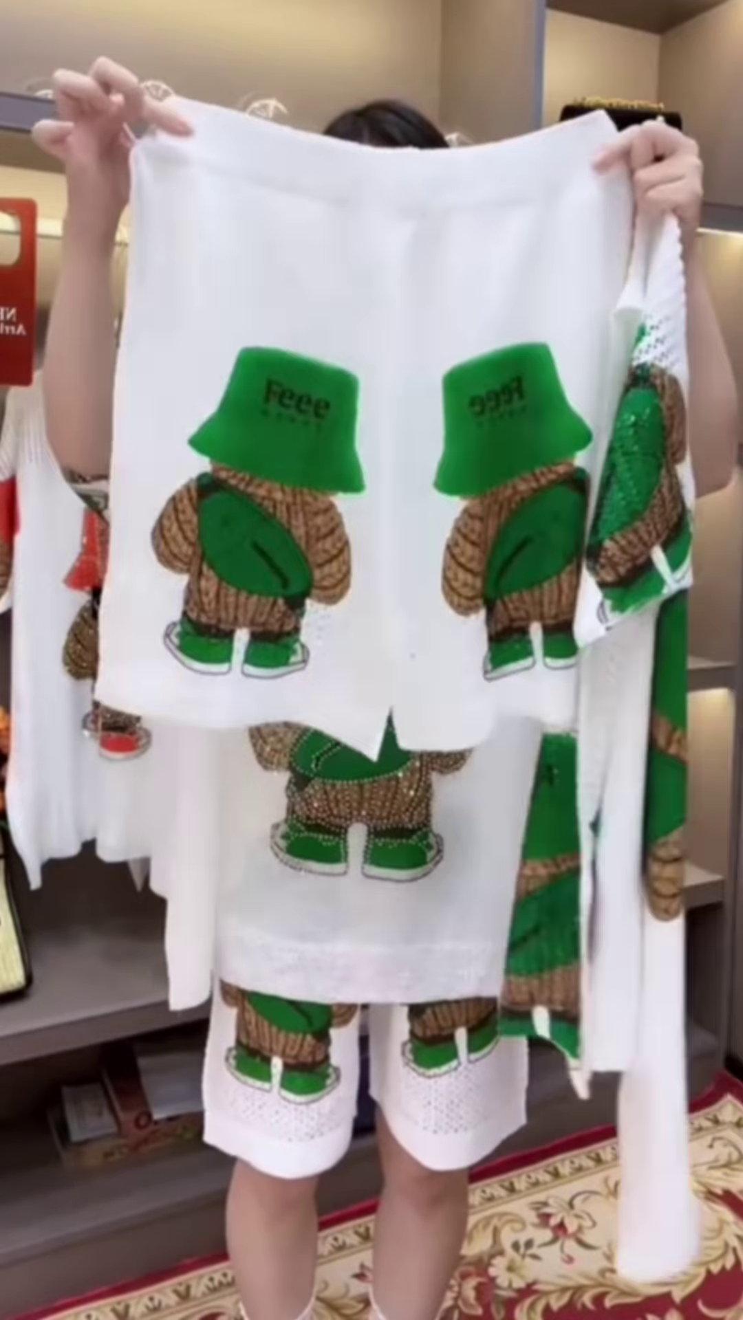 The coordinating shorts continue the theme with matching green and gold accents. They feature the same open-knit texture and a comfortable fit, ensuring ease of movement. The thoughtful design of the shorts with similar embellishments on the hem or a matching graphic detail creates a cohesive and polished look. The combination of the loose-fitting top and the shorts offers a relaxed silhouette that is flattering and comfortable for a variety of body types. This set is designed to be effortlessly chic, requiring minimal styling to look put-together. You can wear it as a complete outfit, or mix and match the pieces with other items in your wardrobe for endless styling possibilities.