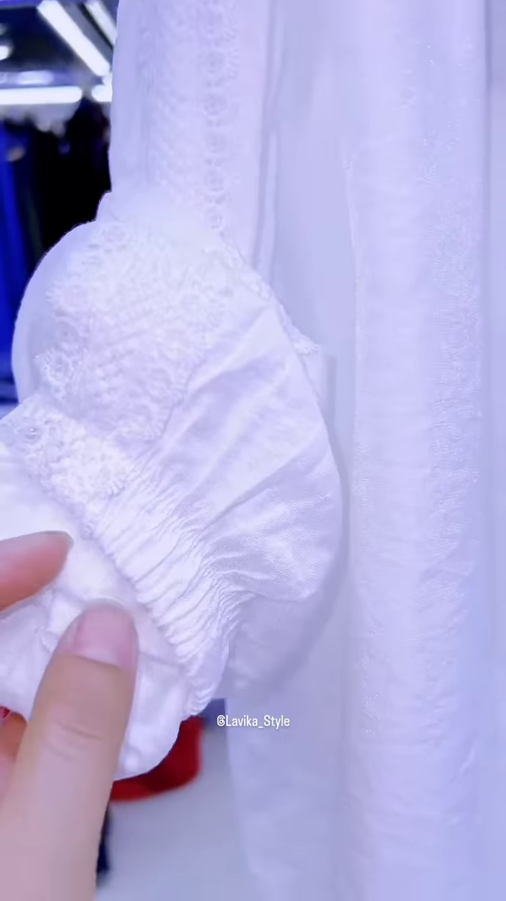 The model’s hands are visible, holding the overshirt in a way that showcases the fabric’s lightness and the flow of the sleeves. The sleeves are pushed up, creating a casual and chic look. The setting includes clothing racks filled with other garments in the blurred background, which places the outfit within a fashion context. The bright and even lighting highlights the clean white color of the garments and makes the blue stones on the necklace sparkle. The overall look is a perfect example of a sophisticated layered style, blending casual comfort with elegant details to create a versatile and beautiful ensemble. The combination of the textured fabric, the subtle inner print, and the bold statement necklace makes this a truly unique and fashionable outfit.