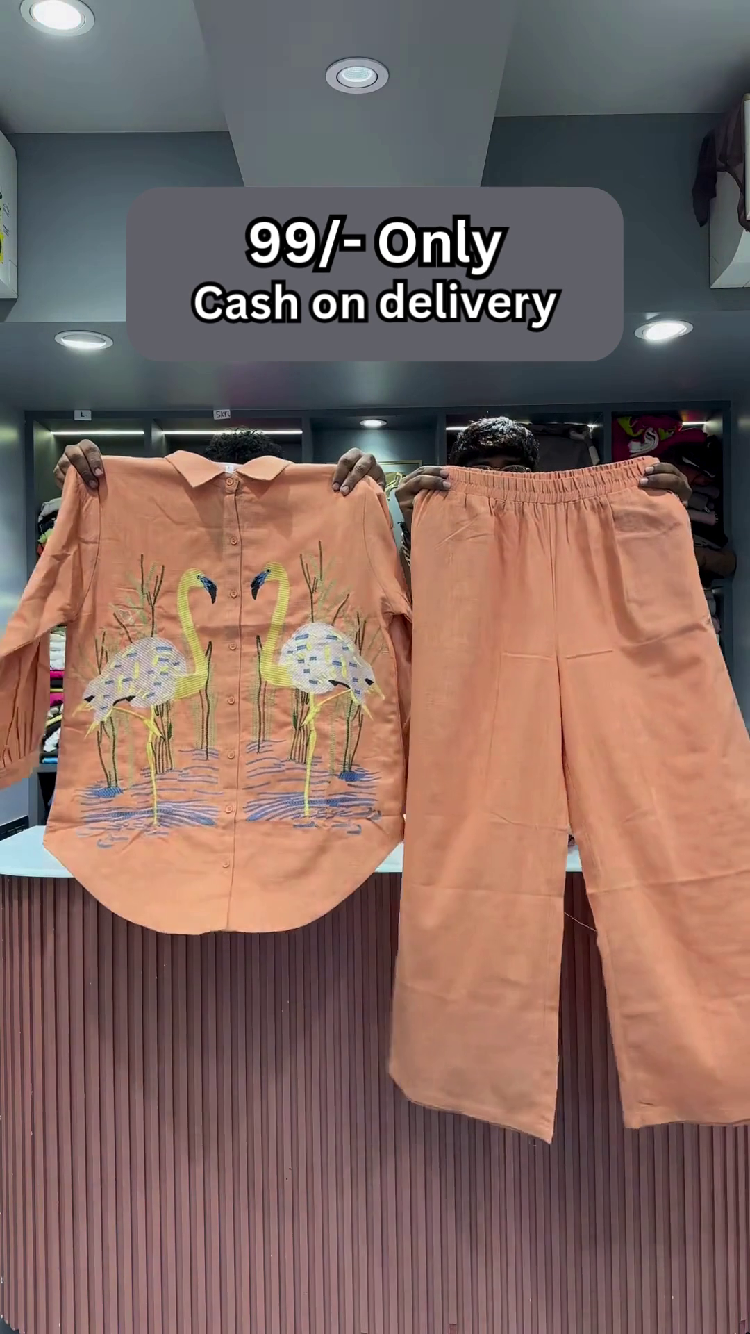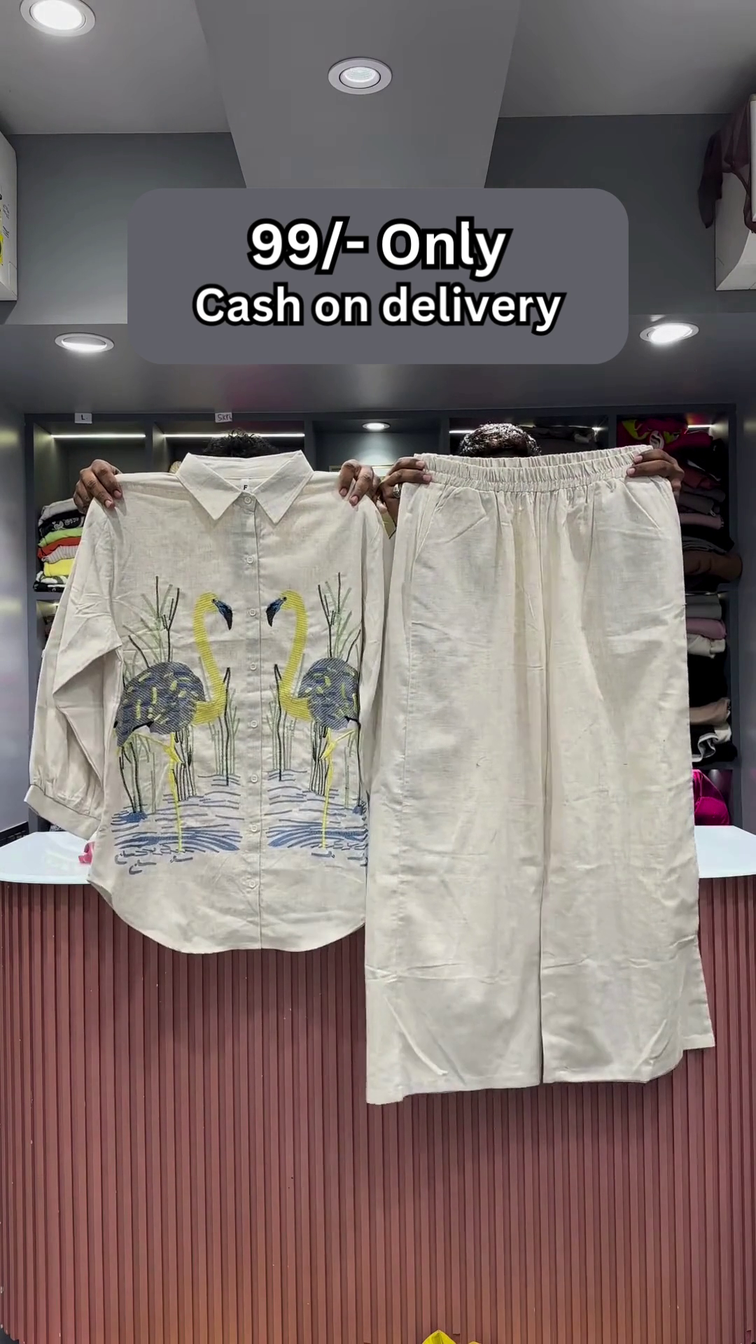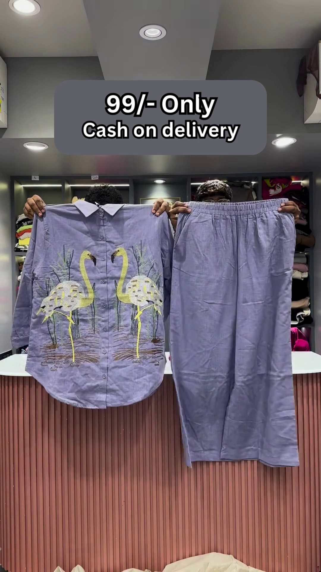 The shirt is the focal point of the set, featuring a classic, collared, and button-down design. However, it is the intricate and charming embroidery on the front that truly sets it apart. On both sides of the button placket, there is a large, beautifully detailed flamingo embroidered in a light, almost iridescent, yellowish-gold thread. The flamingos stand tall, with slender, delicate legs that extend downwards, and their bodies are filled with a dense, detailed stitching. The embroidery also includes elements of the birds’ natural environment, such as thin, vertical lines representing reeds or tall grasses in a darker blue or black thread. This whimsical and artistic embroidery adds a touch of personality and creativity to the otherwise classic silhouette of the shirt.