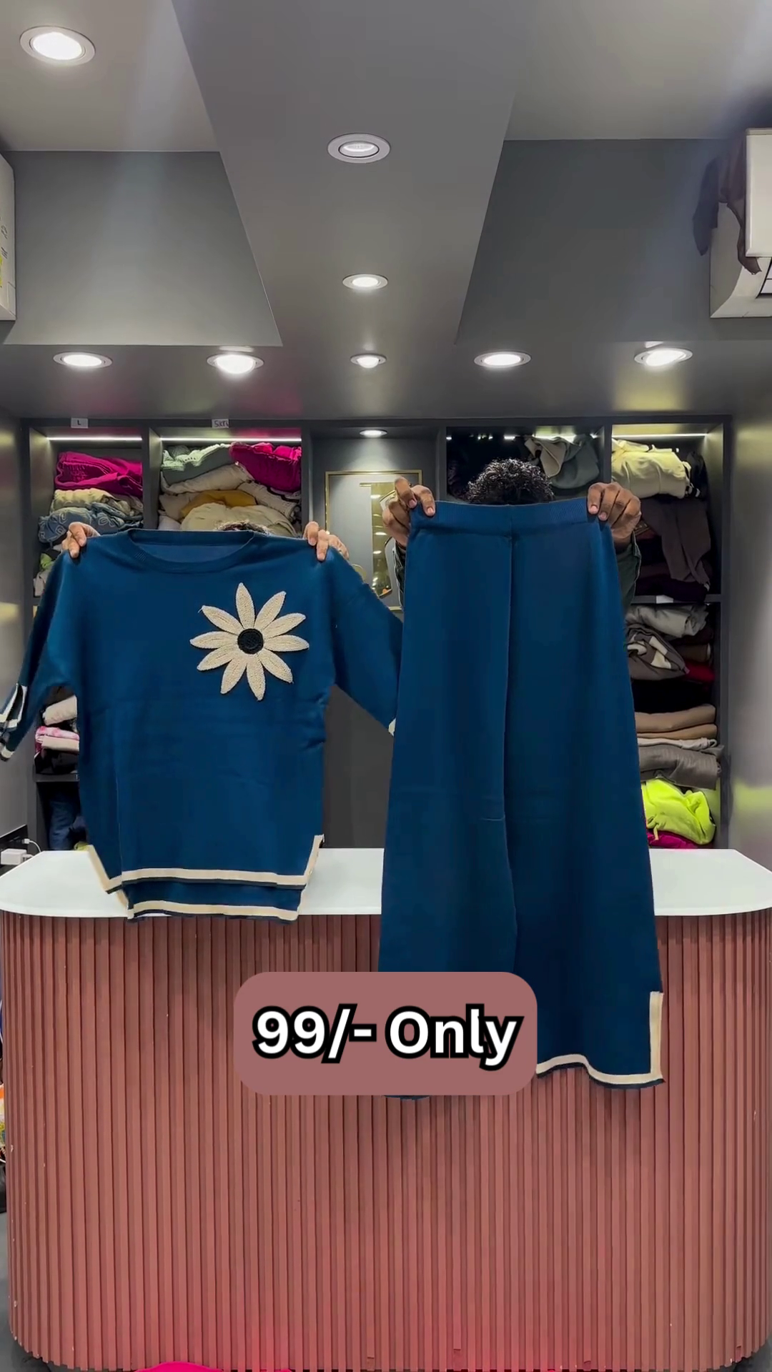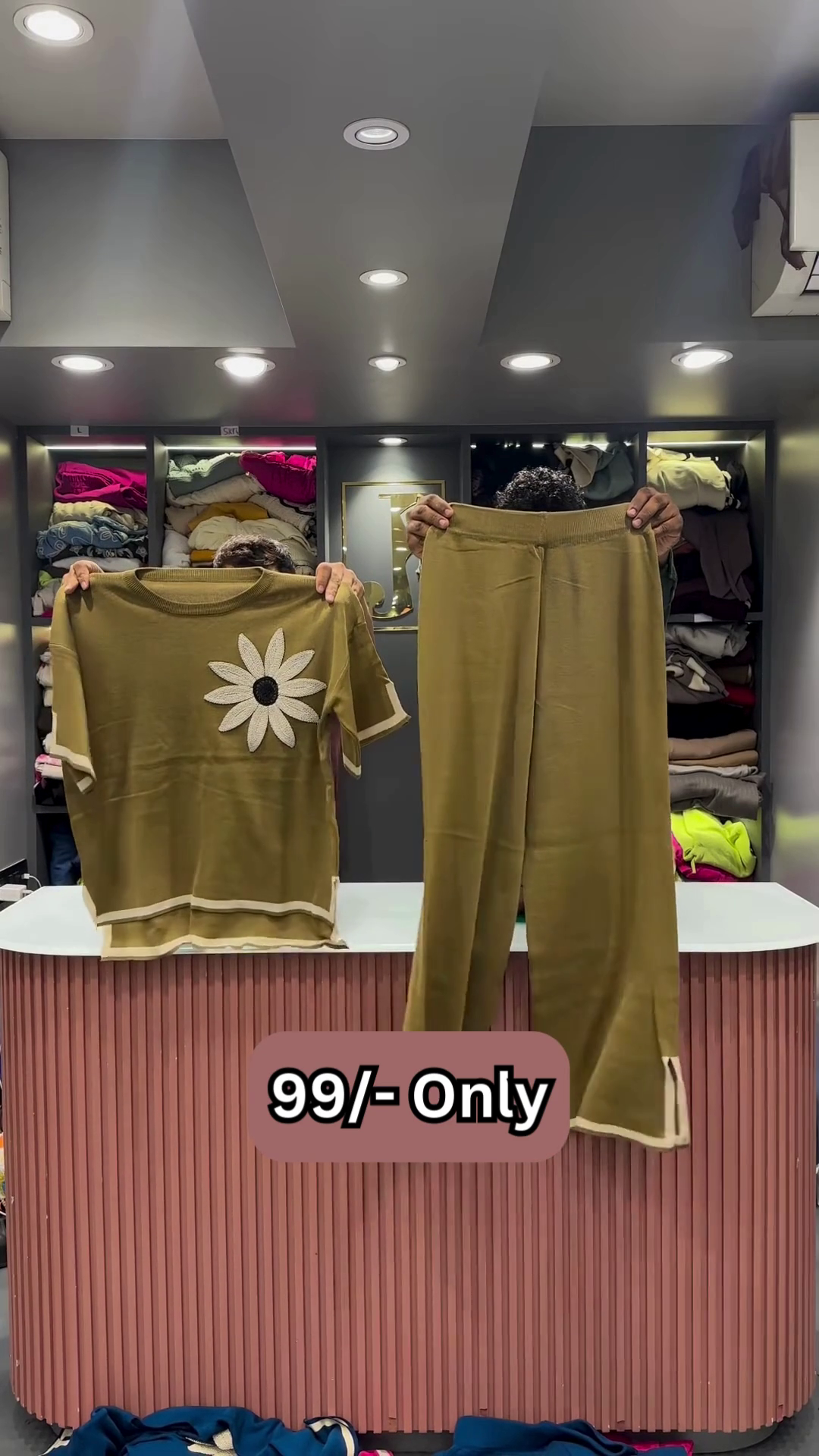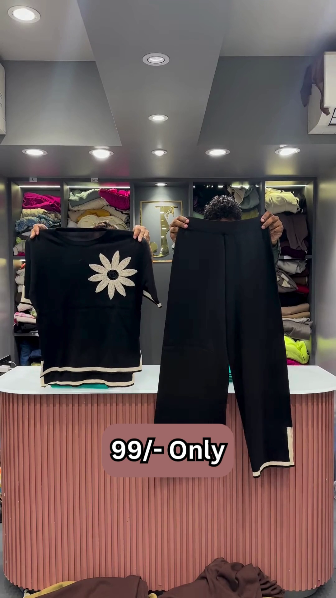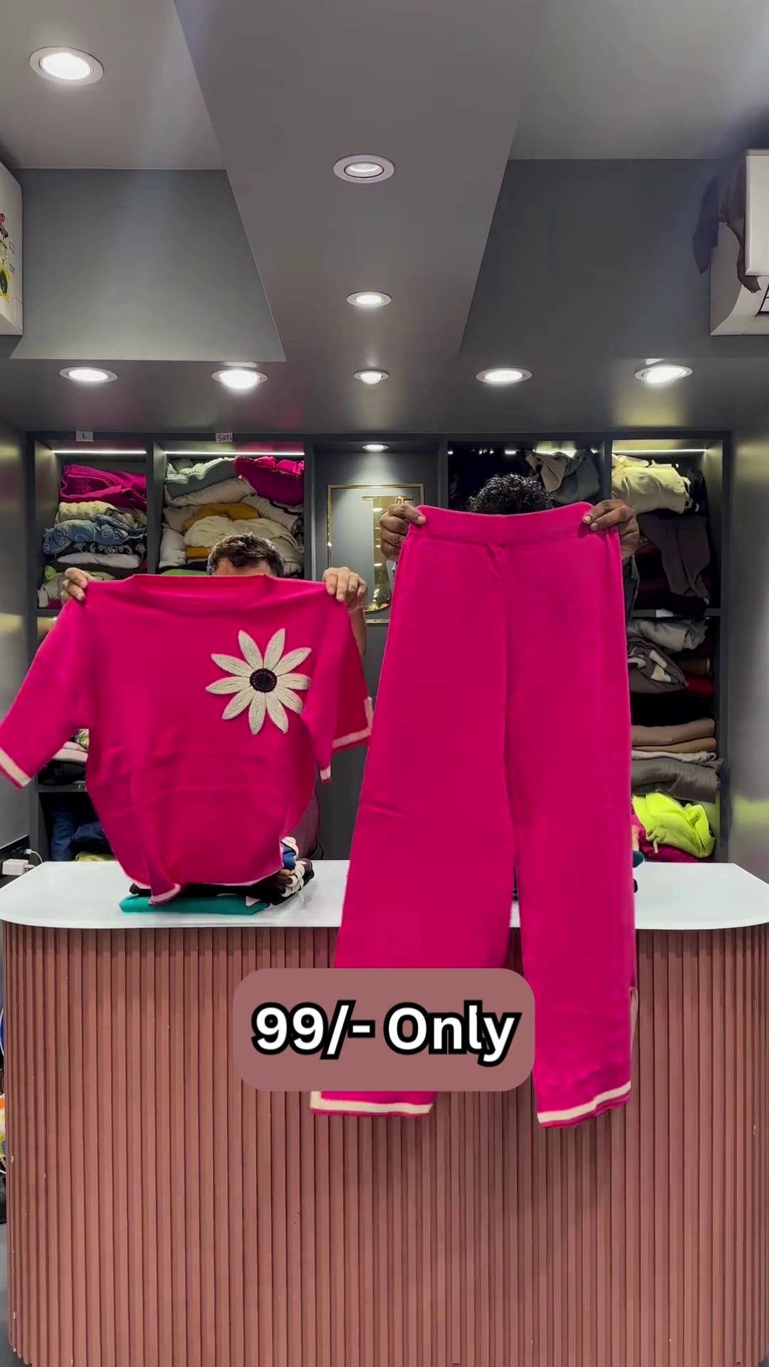 The background provides a clean, commercial context for the product. The two individuals holding the clothes are partially visible, but the focus remains on the garments themselves. The backdrop includes a modern, fluted-style counter in a light, neutral color, which contrasts with the dark maroon of the clothes. Behind the counter are shelves neatly organized with other clothing items, while the lighting is bright and even, highlighting the color and texture of the knit fabric and making the embroidered daisy pop. This two-piece set is a perfect blend of comfort and style. The classic knit material and relaxed fit make it practical for casual wear, while the striking color and charming floral motif make it a fashionable statement piece that is sure to turn heads.