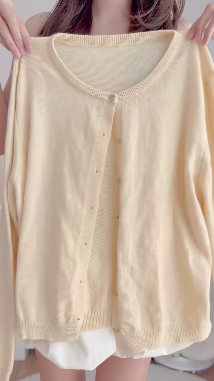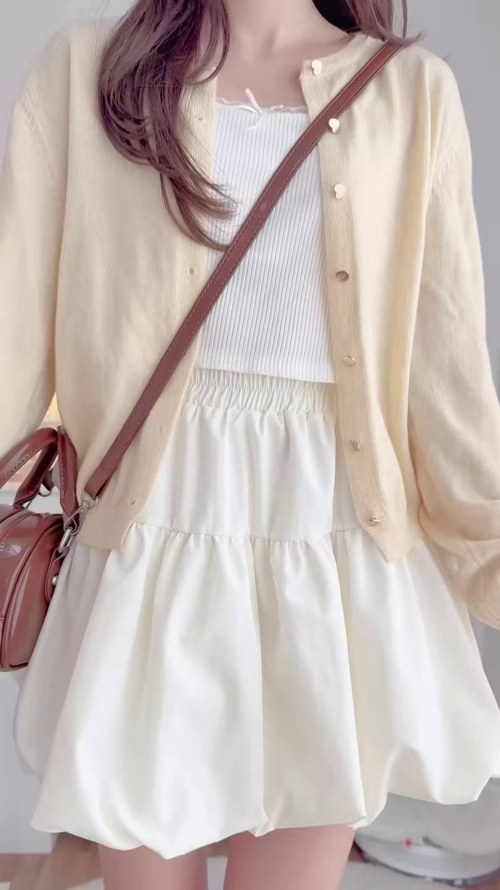 - π£ Light Purple: Ribbed cardigan with five bow-shaped buttons + embroidered heart with βRβ detail