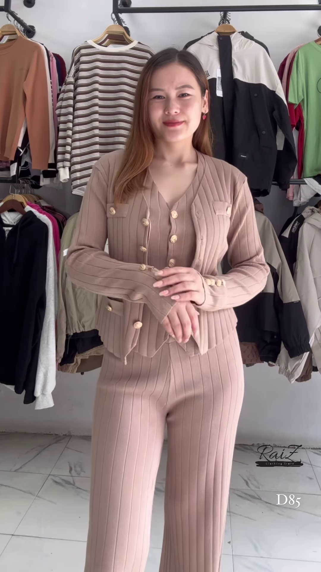 - 🤎 Beige: V-neck ribbed top with decorative buttons on front and sleeves + matching wide-leg pants