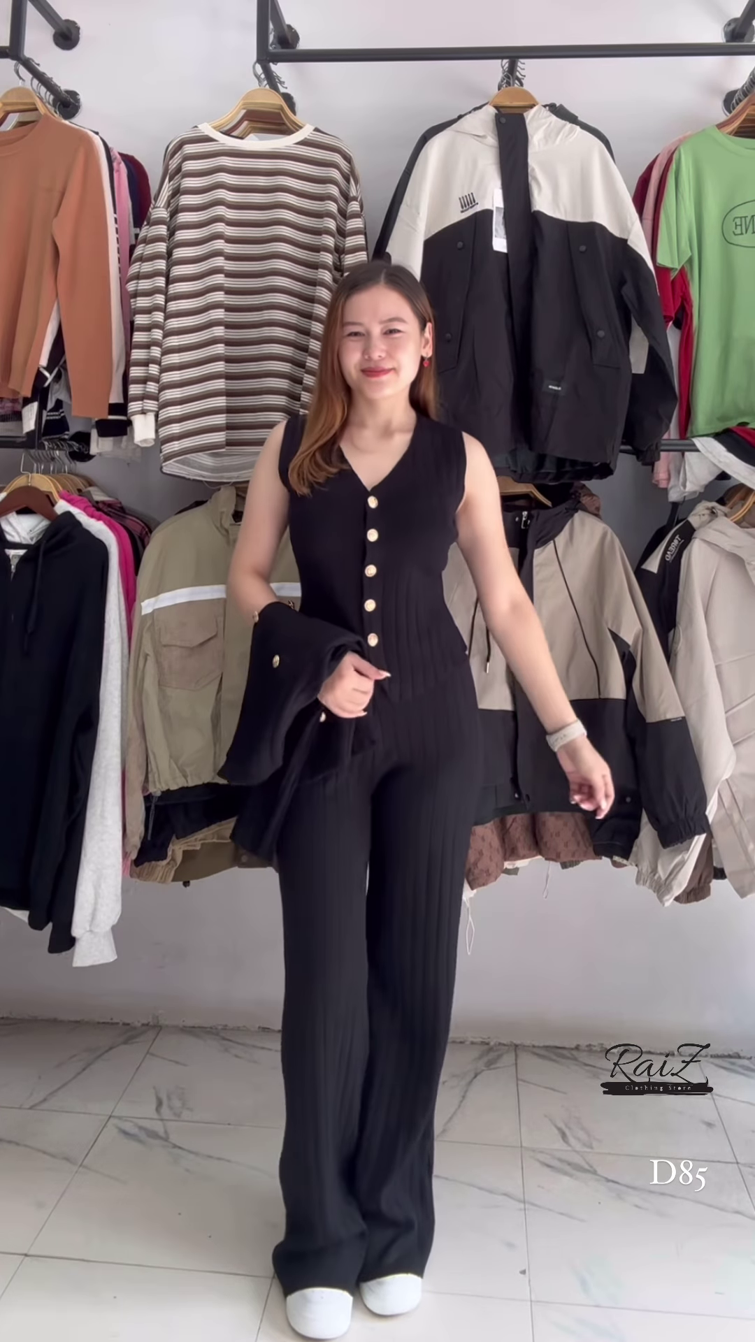 - 🖤 Black: Long-sleeve ribbed top with gold buttons + matching black pants + white shoes for contrast