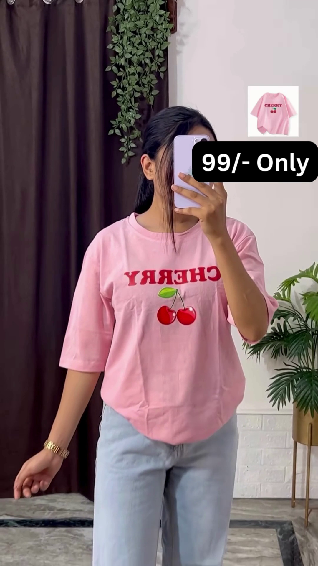 In the image, the woman is holding a light-colored phone, which covers her face, keeping the focus squarely on the clothing and allowing a potential customer to easily envision themselves wearing the outfit. Her accessories are minimal but impactful; she is wearing a gold-toned watch on her wrist, which adds a touch of sophistication to the casual ensemble. The background of the photograph is simple, with dark brown curtains on the left and a green potted plant on the right, providing a natural and pleasing backdrop that doesn’t distract from the product. The bright lighting ensures that all the colors and details of the graphic print are clearly visible, making the shirt look its best. This outfit is a perfect example of combining a bold graphic tee with classic casual pieces to create a fashionable and effortless street-style look.